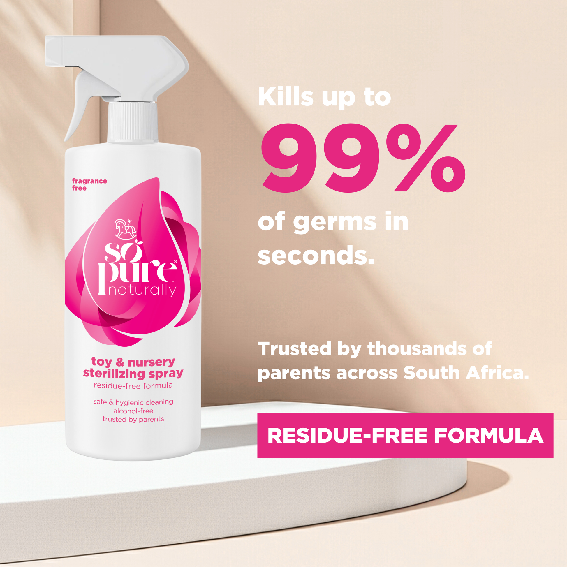 Our versatile toy and nursery steri-mist easily and quickly kills 99.9% of germs, is fragrance-free, eliminates odours and mildly cleans all hard nursery surfaces, changing tables, baby and toddler’s toys, matts, high chairs and prams without the use of harmful chemicals or additives.